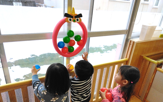 四季の森公園でそり遊びを楽しみ行ってきました。保育室では、鬼のお面や氷づくりにも挑戦しました☆