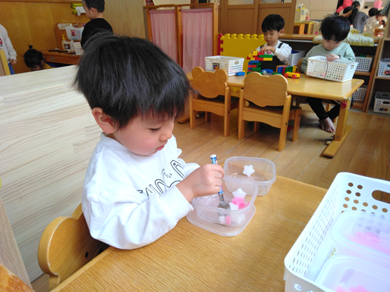 保育室で1人で集中して遊んだりお友達と一緒に遊んだりしましたよ♡今月もげんきいっぱいのつぼみちゃんです♪